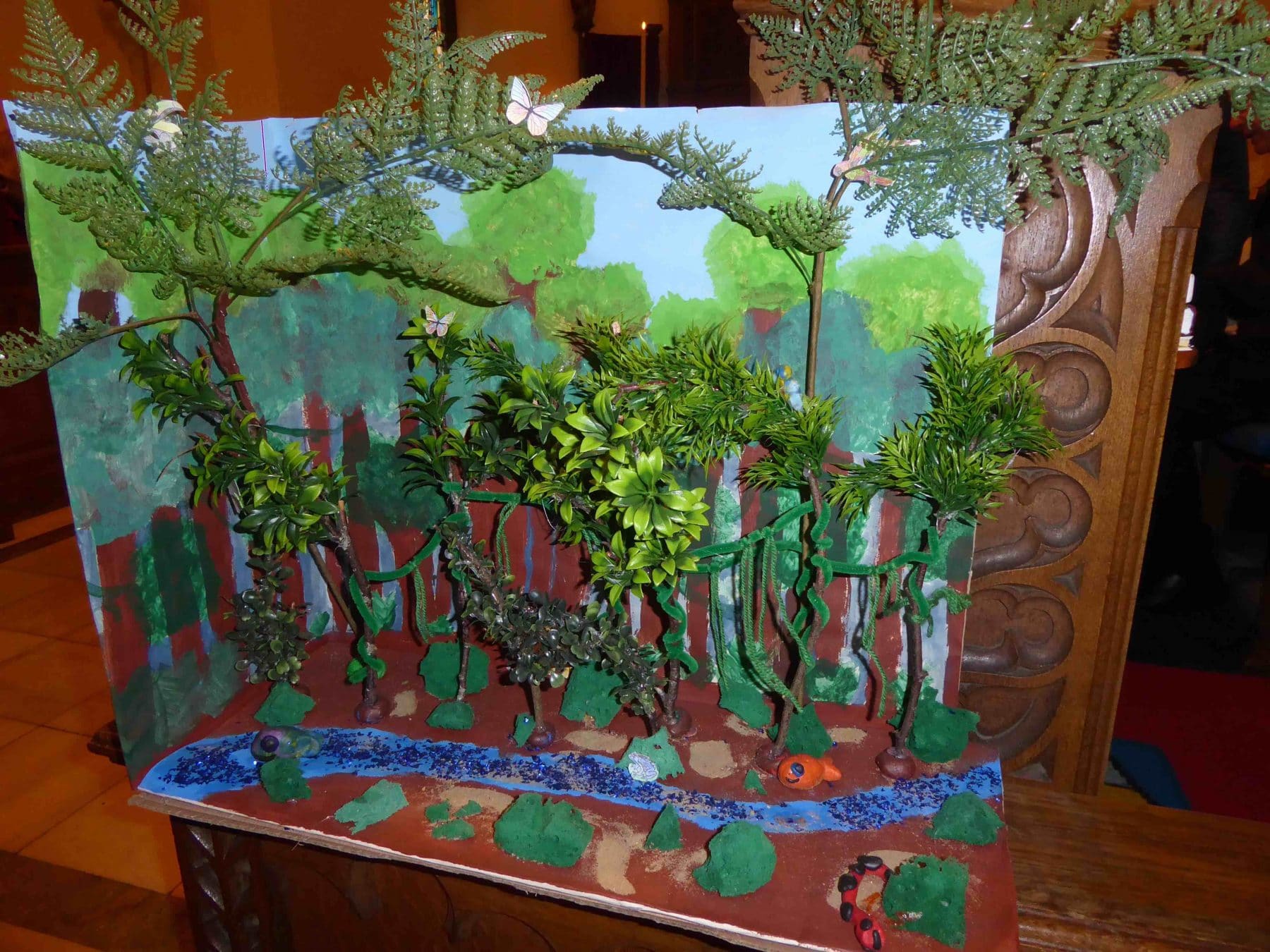Our All Age Family Service had a different format to it today as it was taken by the children themselves. Niamh and Addie Jopp had prepared the service on the theme of “Stop Destroying God’s World” and had made a lovely model which was displayed in church. Niamh also played a beautiful flute solo during Communion. Matilda and Chloe took up the bread and wine to the altar.