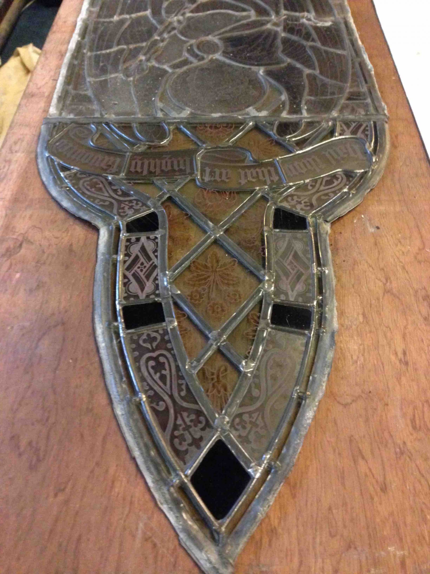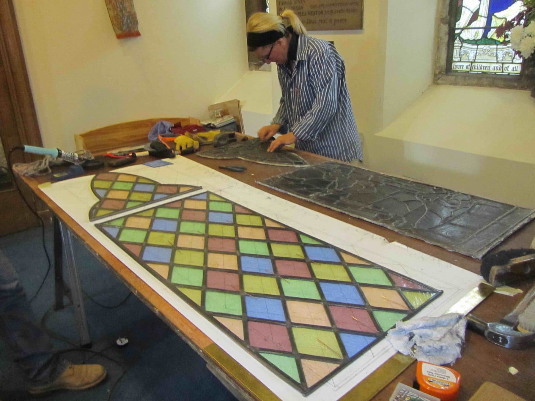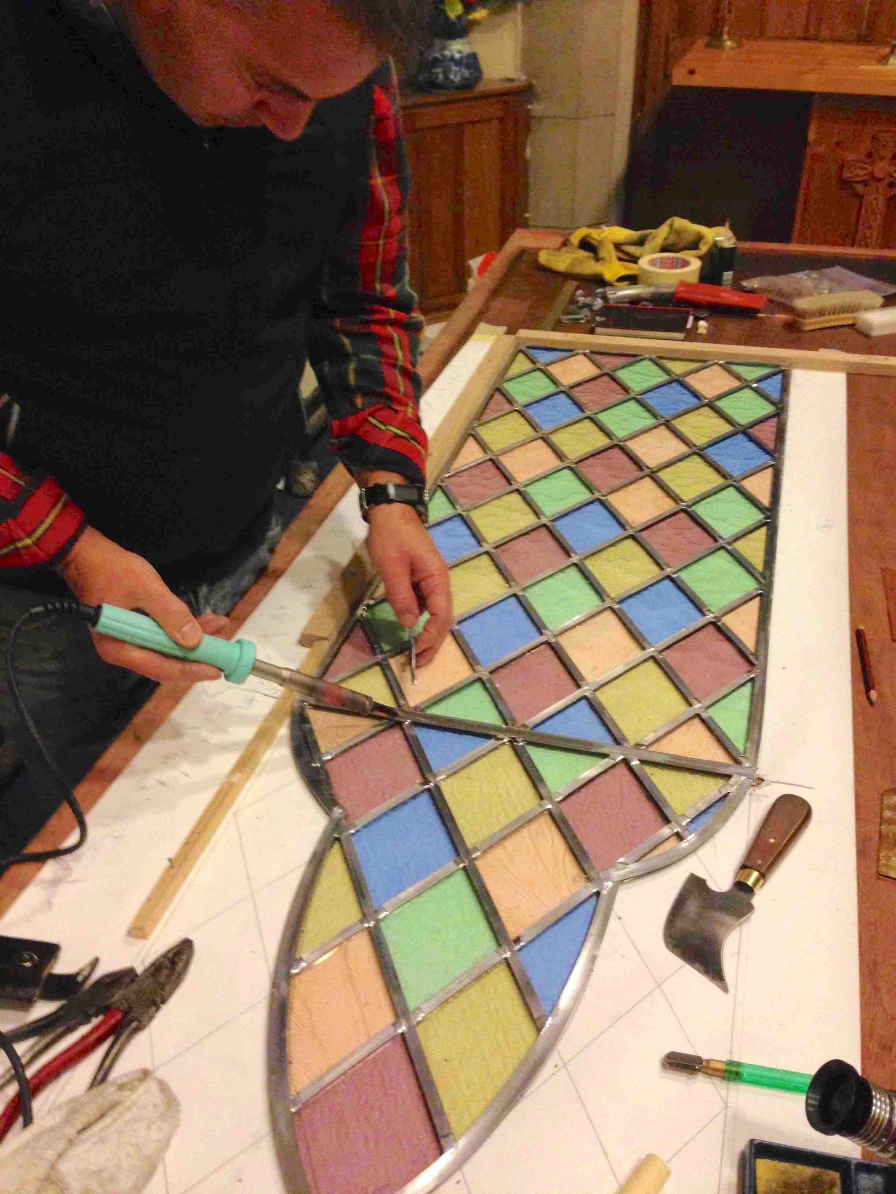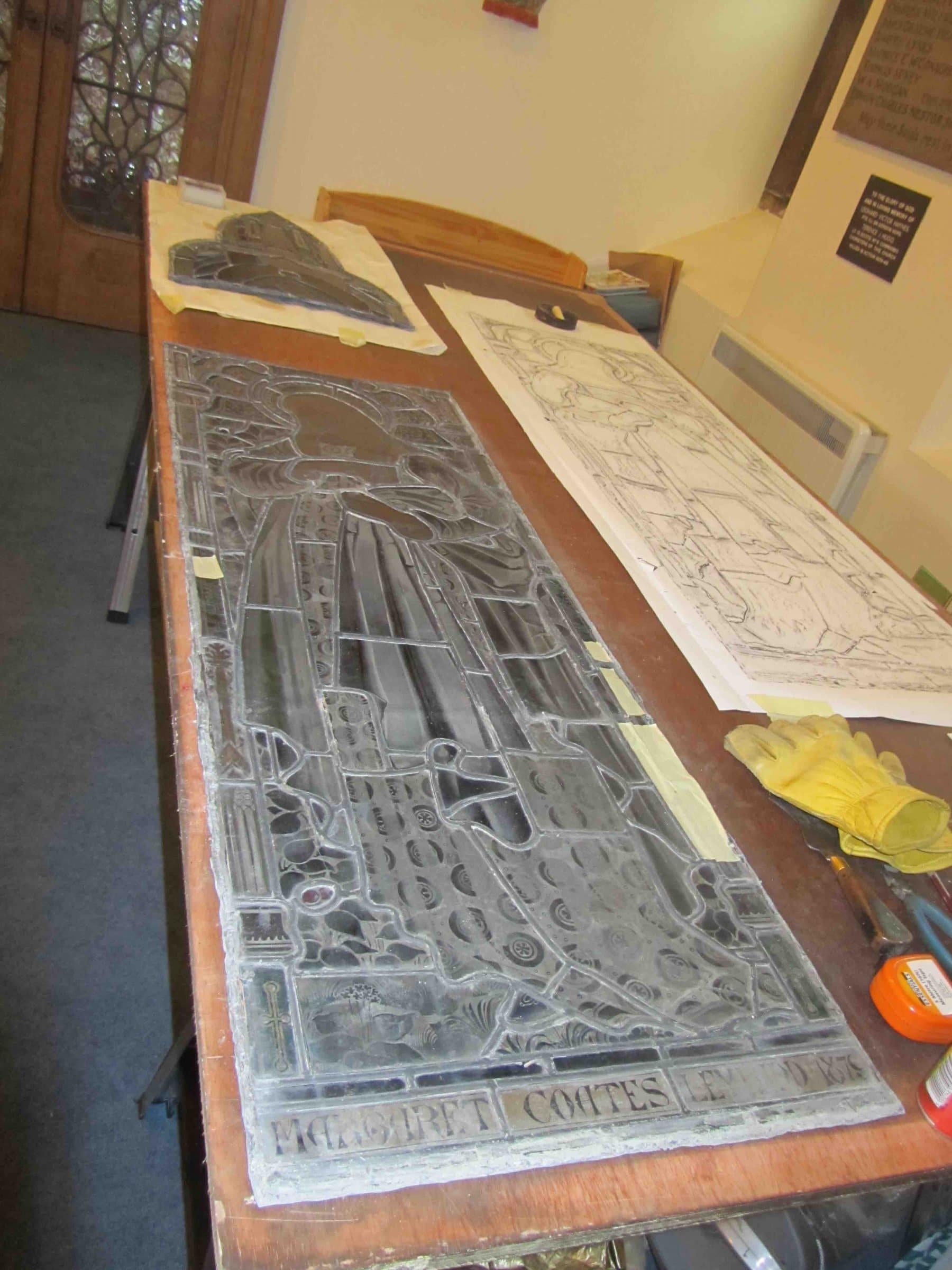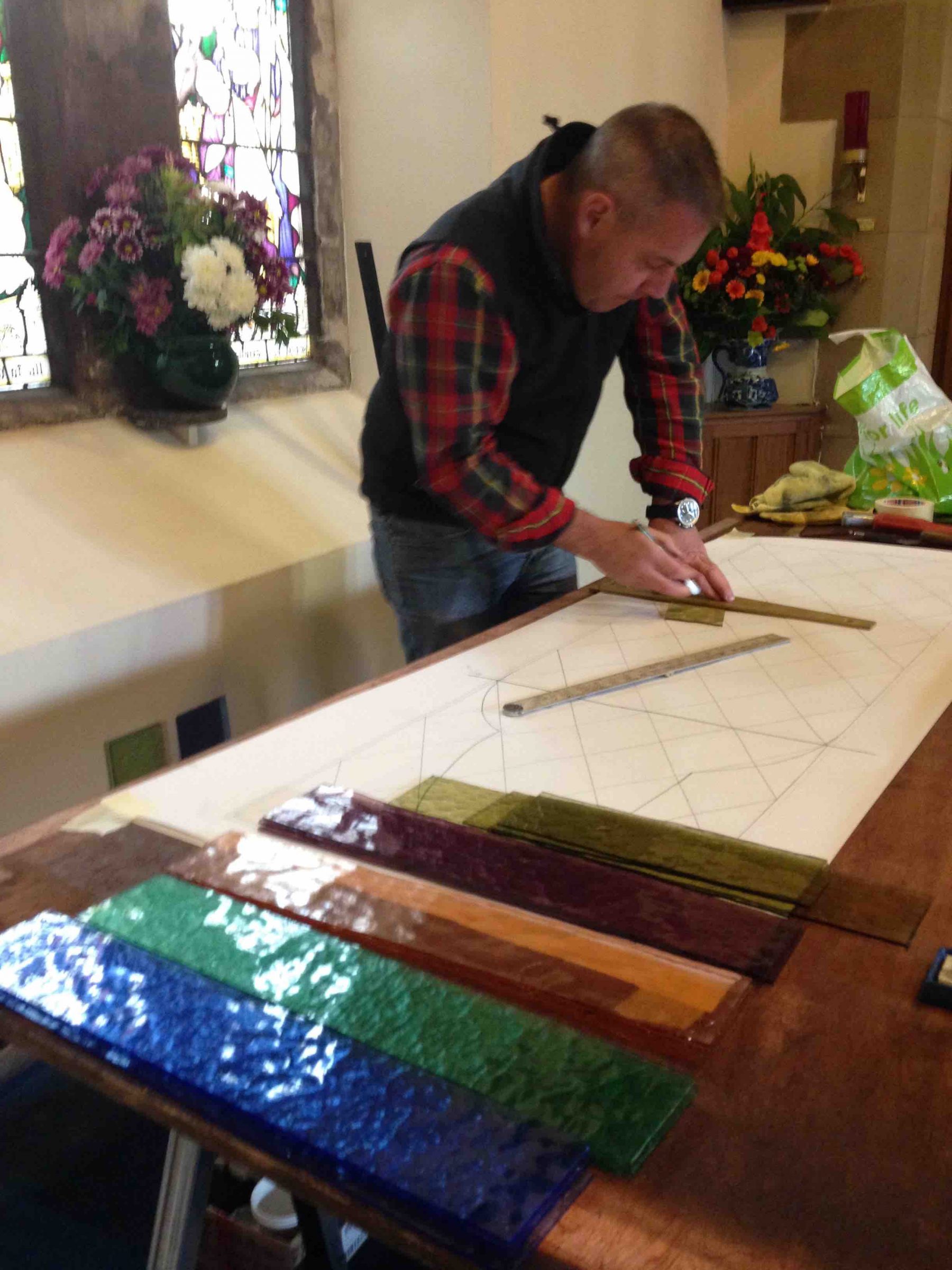 Bryan Hutchison, a stained glass expert, has made a magnificent job of doing this with the toilet window finished and the Gabriel window ready to be inserted in the light box.